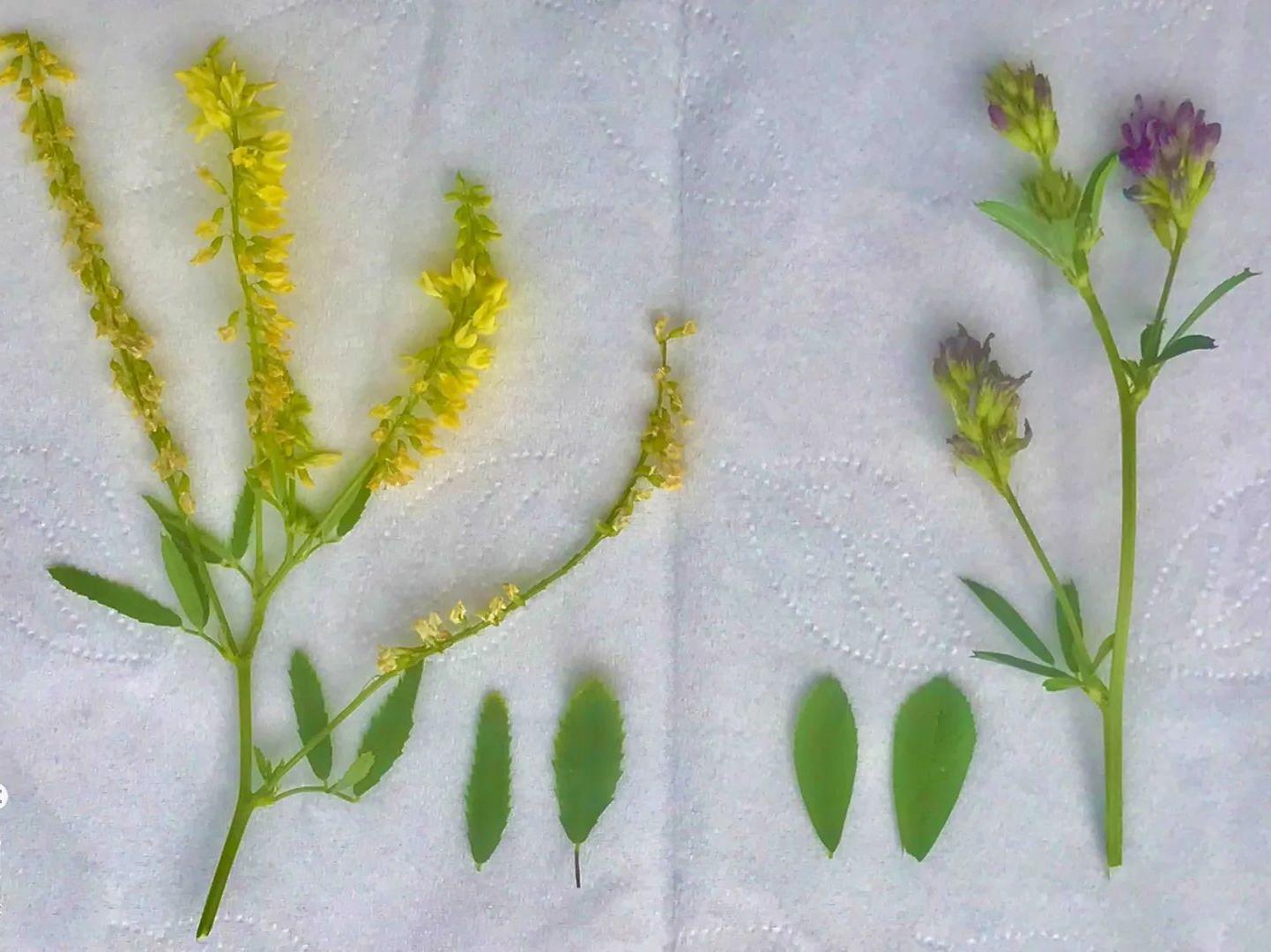 花:紫花苜蓿花序總狀或頭狀、花色為深藍至暗紫色,花穗較草木樨短;黃花草木樨總狀花序,花小,花黃色。