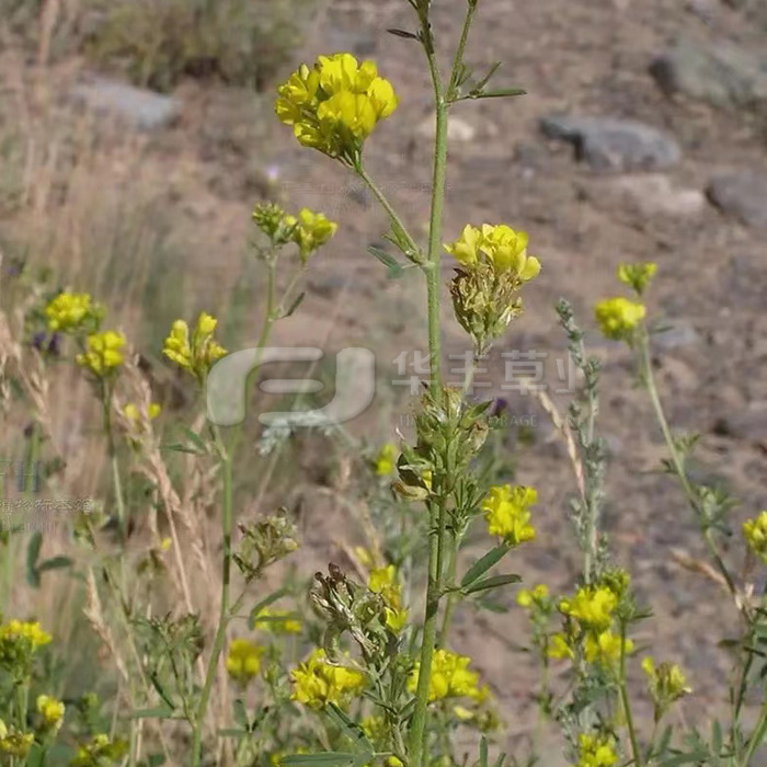 黃花苜蓿,別名野苜蓿,多年生豆科草本植物。根粗壯,莖斜升或平臥,長30-60(100)cm,多分枝。羽狀三出復(fù)葉,小葉倒披針形、倒卵形或長圓狀倒卵形,邊緣上部有鋸齒,下部全緣??偁罨ㄐ蛎芗深^狀,腋生,花黃色,蝶形。莢果稍扁,鐮刀形,稀近于直立,長1-1.5mm,被伏毛,含種子2-4粒。