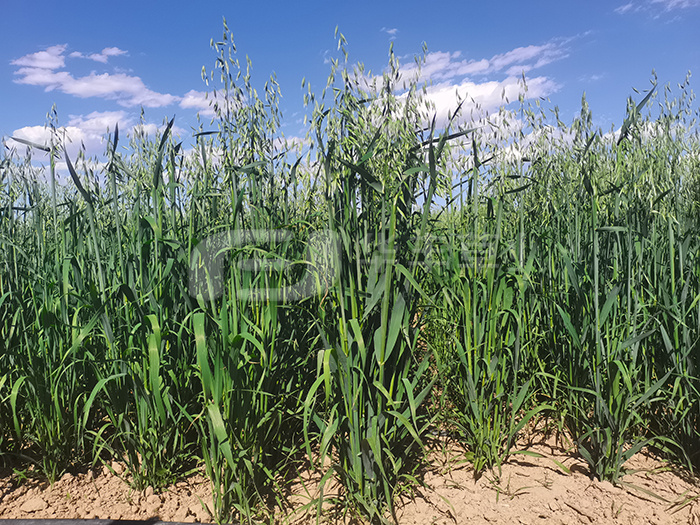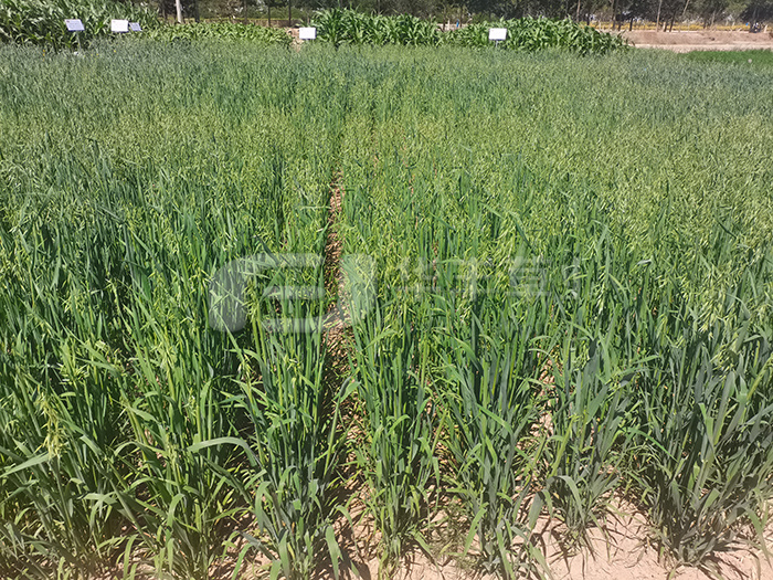 生育天數(shù)108~119天。植株直立,株高120-140cm,分蘗數(shù)2~4個(gè),莖直徑0.4-0.6cm。葉長(zhǎng)21.5-35cm,葉寬1.1-2.3cm,葉片與莖的夾角較小,直立型好,群體密度好,抗倒伏。種子無(wú)芒,穎殼淺黃色,千粒重約38g。在中等肥力條件下,干草產(chǎn)量550-650kg/畝。