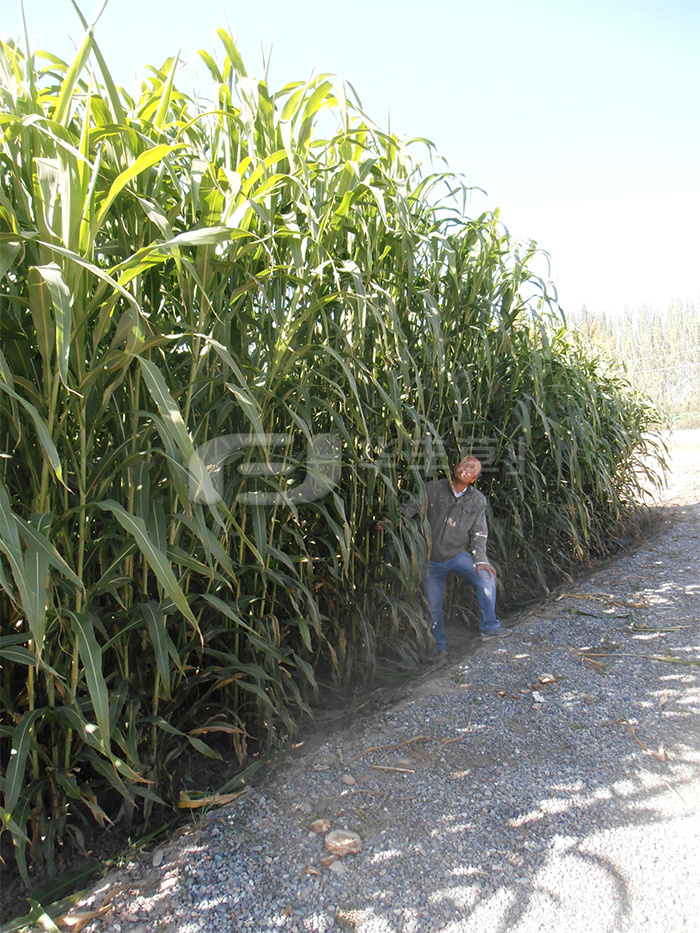 一年生禾本科牧草,生育期120d左右,紫色芽鞘,幼苗綠色,葉鞘綠色,殼色紫色,籽粒淺黃色,株高329cm,葉片14-17片,根系發(fā)達(dá),莖稈柔韌,臘質(zhì)葉脈,分蘗性強(qiáng),平均分蘗數(shù)2.18個(gè),莖粗1.26cm。北方一年可刈割2-3次,再生能力強(qiáng),生長(zhǎng)迅速,光熱和水肥條件充足日生長(zhǎng)量在9-12cm/d,鮮草畝產(chǎn)在5000-8000kg。 干物質(zhì)含量17.0%,干重百分比中,粗蛋白占8.70%,粗灰分8.4%,木質(zhì)素7.18%,中性洗滌纖維62.9%,酸性洗滌纖維33.7%,莖中氫氰酸含量為8.64mg/kg,葉中氫氰酸含量為15.8 mg/kg,飼喂品質(zhì)優(yōu);高抗絲黑穗病,抗葉斑病,抗高粱蚜。