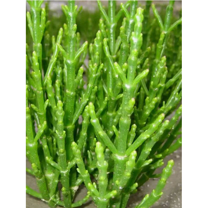 鹽角草(Salicornia europaea L.)是藜科鹽角草屬一年生草本植物,株高可達(dá)35厘米。莖直立,多分枝,枝肉質(zhì),葉不發(fā)育,鱗片狀,頂端銳尖,基部連合成鞘狀,邊緣膜質(zhì)?;ㄐ蛩霠睿干?,花被肉質(zhì),圓錐狀,上部扁平成菱形;雄蕊伸出于花被之外;花藥矩圓形;子房卵形;鉆狀,果皮膜質(zhì);種子矩圓狀卵形,種皮近革質(zhì),6-8月開(kāi)花結(jié)果。