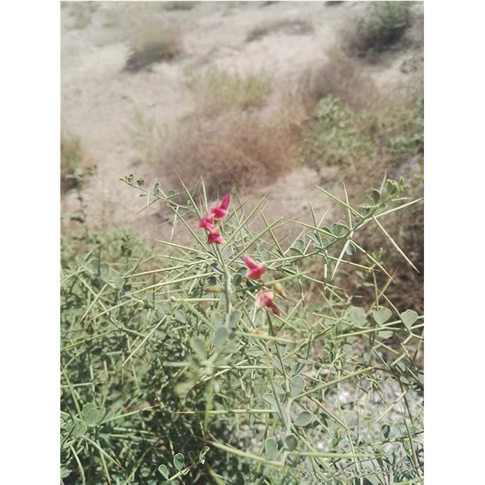 駱駝刺(Alhagi camelorum Fisch.)是豆科駱駝刺屬半灌木草本植物。 株高30-60厘米,它的莖直立,有細(xì)條紋,無毛或幼莖有短柔毛,從基部分枝,灰綠色,具針刺;單葉互生,外形為卵形、卵圓形或矩圓形,先端鈍,全緣;總狀花序腋生,先端針刺狀,無毛,花長在刺上,花萼鐘狀,具五齒;被短柔毛,萼齒三角狀或鉆狀三角形,花冠深紫紅色,旗瓣倒長卵形,頂端鈍圓或截平,基部楔形,具短瓣柄,翼瓣長圓形;果線形,彎曲形狀。種子1-6個(gè),腎形;駱駝刺花期為6-7月,果期為8-10月。因其是戈壁灘和沙漠中駱駝**能吃的草料而得名。
