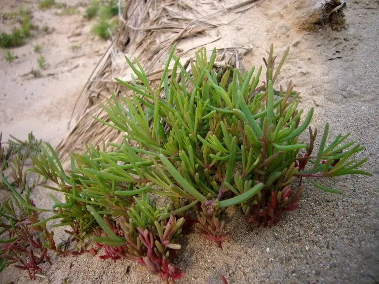 堿蓬是莧科堿蓬屬一年生草本植物,高可達1米。莖直立,上部多分枝,分枝細(xì)長。葉絲狀條形,半圓柱狀,稍向上彎曲。花兩性兼有雌性,單生或2-5朵團集,大多著生于葉的近基部處。胞果包在花被內(nèi),果皮膜質(zhì)。種子橫生或斜生。花果期7-9月。